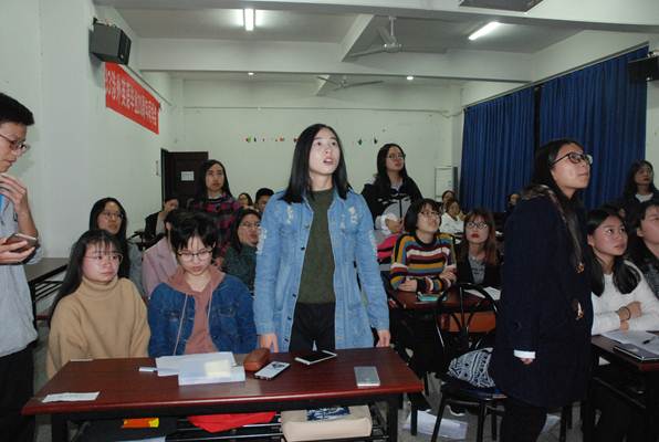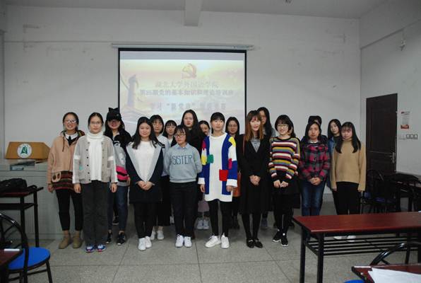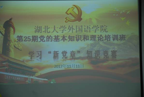 为了深入学习党的十九大报告,切实贯彻、坚决维护党章,学会用党章武装头脑、规范行为、指导党的建设和工作,湖北大学麻花豆传剧剧mv入口于11月11日晚18:30在逸夫楼A1010举行了学习“新党章”知识竞赛,第25期党的基本知识和理论培训班36名成员参与该活动。本次竞赛共计5组参赛队,分别为大英语党支部A组、大英语党支部B组、小语种党支部C组、小语种党支部D组、研究生+学生组织党支部E组,每组3人。培训班其他学员均为观众。