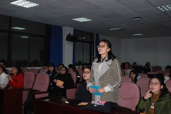 本场比赛分为四个环节。第一个环节选手轮流答题选出6名选手进入下一轮。第二环节选手两两PK,对决双方通过抽签产生。其中第二组对决尤为激烈,两位选手在场上轮流答题超过40道,双方势均力敌,毫不示弱,现场观众看得目不转睛。第三环节选手抢答,上一环节获胜的三名选手通过按抢答器获得抢答机会。该环节选手们从一开始的按兵不动到渐入佳境,到最后的激烈抢答,给观众带来了一场精彩的头脑风暴。第四环节为最终角逐,两位选手轮流答题直至一方答错,经过一番比拼,最终2016级英语国贸专业的黄逸涵脱颖而出夺得桂冠。
