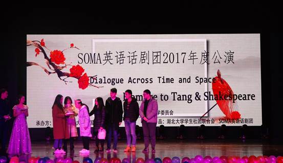 晚会开始前,郭熙煌院长以流利的英文向全场嘉宾作开场致辞。他向SOMA的全体工作人员表达了浓厚的敬意,抒发了对SOMA英语话剧团2017年度公演暨湖北大学社团文化节特色活动圆满落幕的美好愿望。