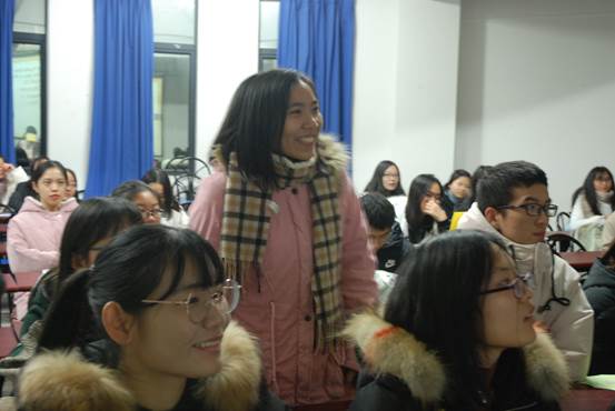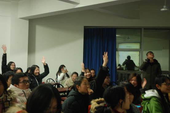 此外,比赛过程中还设置了两轮互动答题环节,观众们踊跃举手参与答题。工作人员为参与互动的同学们准备了精美笔记本、便利贴和相片架等小礼品。现场还有轻快的英文背景音乐,整个教室沉浸在愉悦的氛围中。