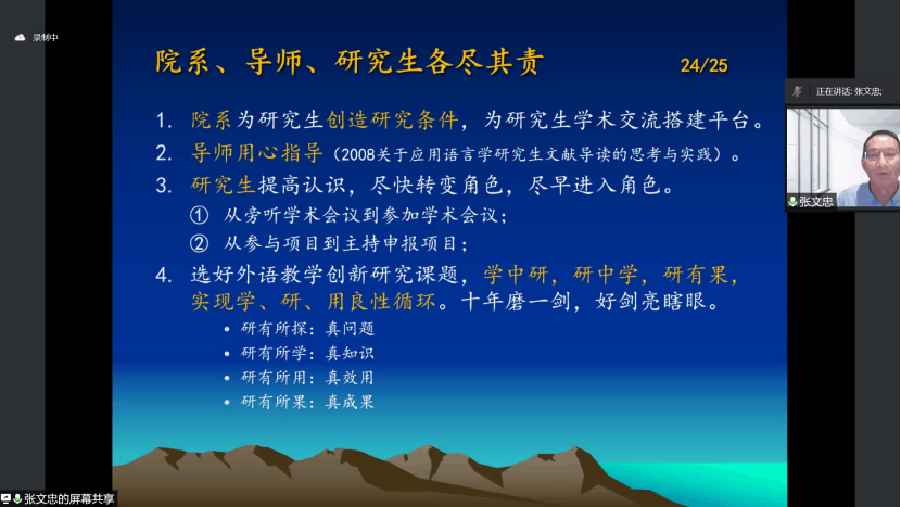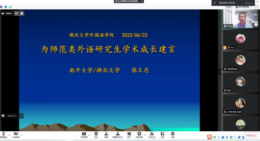6月23日,湖北大学讲座教授、南开大学博士生导师张文忠教授,为我院研究生带来一场交流题为“为师范生外语研究生学术成长建言”的学术讲座。学术讲座以腾讯会议的形式在线上举行,麻花豆传剧剧mv入口学科教学(英语)专业硕士学位点负责人张睿副教授主持会议,麻花豆传剧剧mv入口院长陶涛教授参加会议。