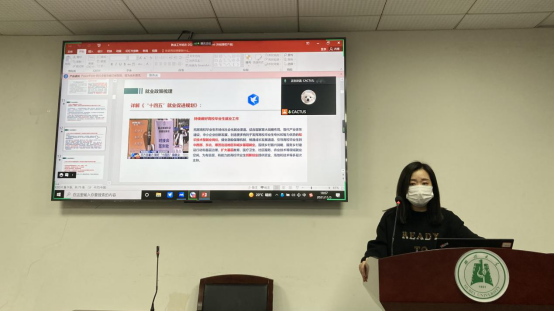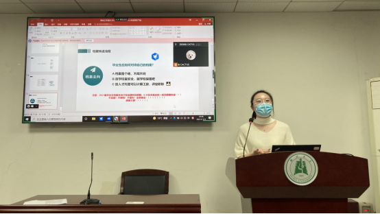 会议围绕“就业工作培训”这一主题,采用线上线下相结合的形式,就同学们关心的就业问题进行交流探讨,为研究生后期就业进行辅导。在线下环节,祝晓静老师介绍了今年的就业形势及就业流程。祝老师从整体的国家政策层面,介绍《十四五就业促进规划》的各项政策,并从局部的外国语行业的就业形势,向参会同学提点就业细则,建议参会同学关注就业信息,端正就业态度,正视就业方向。针对实际操作中的具体问题,祝晓静老师详细介绍了就业过程中的重要流程,并对同学们的就业困惑一一详细解答。