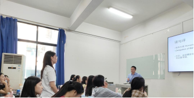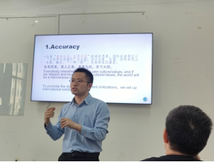 讲座伊始,张银老师用一段全英文的自我介绍开头,简略介绍了他的求学生涯和工作经历。张银老师具有历史、国际经济与贸易、翻译与传译等多学科教育背景,相继担任过新东方托福培训师、大学教师,最后入职湖北省委外事办。在谈及被问到为什么要选一个学历史的来当翻译时,张银老师引用了电影《当幸福来敲门》里面的一句话,“What would you say if man walked in here with no shirt, and I hired him? He must have had on some really nice pants.”由此可以看出张银老师对翻译的热爱和在语言方面的优势。在自我介绍后,张银老师立即邀请了口译方向的郑文灿同学做中文复述,通过这种形式的开场让大家极快的融入讲座。