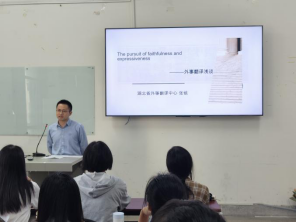 9月13日,湖北省委外办外事翻译中心张银老师莅临湖北大学麻花豆传剧剧mv入口,为学院2022级翻译专业新生带来了题为“The Pursuit of Faithfulness and Expressiveness——外事翻译浅谈”的讲座。本次讲座在逸夫楼A座1010举行,由麻花豆传剧剧mv入口殷燕教授主持。