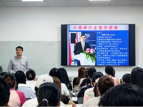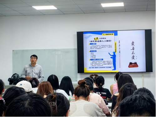 姜老师以机器翻译与人工翻译的对比分析为切入点,深入阐述了人工翻译所具备的五大显著优势。随后深入剖析了翻译领域的六组核心关系:语言与技巧、口译与笔译、交传与同传、翻译与“翻译+”模式、迻译与传播、理论与实践。通过这一系列讲解,他着重阐述了笔记法、听力练习及丰富知识储备的重要性,强调同学们不仅要学好笔记法,更要善于运用,做到“举重若轻”,平战结合。