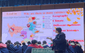 第二堂课是刘梦婷老师的英语公开课,聚焦“CULTURE AND CUISINE”,讨论文化与饮食间的紧密联系。课前导入以一段八大菜系的视频引起学生兴趣,读前环节鼓励学生思考“cuisine”的含义并且预测本节课的大致内容,读中环节引导学生仔细阅读文本,回答与文本细节有关的问题,读后环节引导学生积极思考并讨论饮食与文化间的关系,推动学生批判性思维的发展。
