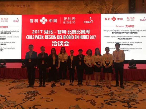 2017年9月7日-9日,第三届“智利周”在武汉举行,“智利周”是由智利政府组织的推广智利国家形象、展示其商品及服务出口实力的全球性活动,2017湖北-智利比奥比奥周系列活动参会单位为国内外知名企业,如中国长江航运集团,武汉中博酒业股份有限公司,中商平价连锁有限公司,赖凯雷特进出口食品有限公司等中方企业代表以及CIPACHILE, Agricola El Manzanar de Picoltue Ltda.,Blue Ocean SPA, Austral Garden of Seaweed S.A.等。根据湖北省外事办安排,湖北大学麻花豆传剧剧mv入口口译队10名志愿者承担了本次“智利周”的大会服务接待工作,为中智企业代表提供口译服务。
