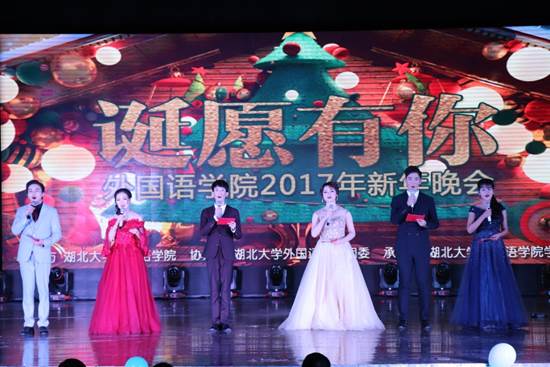 晚会以感恩为主题,旨在让同学们学会感谢过去一年陪伴在左右的亲朋师长,因为有你,前行的道路便不再孤单;感谢未来一年还会一直相伴的你们,‘诞’愿有你,未来的美好我们共同创造。本场晚会共有13个节目,六个歌唱类节目、两个舞蹈类节目、三个表演类节目、一个相声节目和一个朗诵节目。歌唱类节目中,由张庆宗老师和王珺珺老师合作的节目《You Raise Me Up》反响热烈,将晚会的氛围推向高潮。舞蹈类节目中由6个同学带来的舞蹈串烧《Merry Notes》,活力四射展现了舞者的青春活力。表演类节目中由樱花社带来的改编版《你的名字》深入人心,剧本加入了同学们熟悉的湖北大学和螃蟹岬等地点名词,代入感极强,表演者的日语功底更是深厚扎实。由三个主持人带来的朗诵节目《写给未来的你》,通过余光中先生的文章给予同学们厚望。SOMA社团带来的《学英语》相声惟妙惟肖,台下观众投来阵阵掌声。