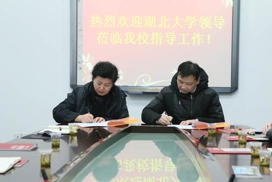 随后,外语学院张院长与武汉六中任校长作为代表共同签署共建实习基地友好协议,外院林书记与六中夏书记为湖北大学麻花豆传剧剧mv入口与武汉六中实习实训基地正式揭牌,同时还赠送了推免生喜报。