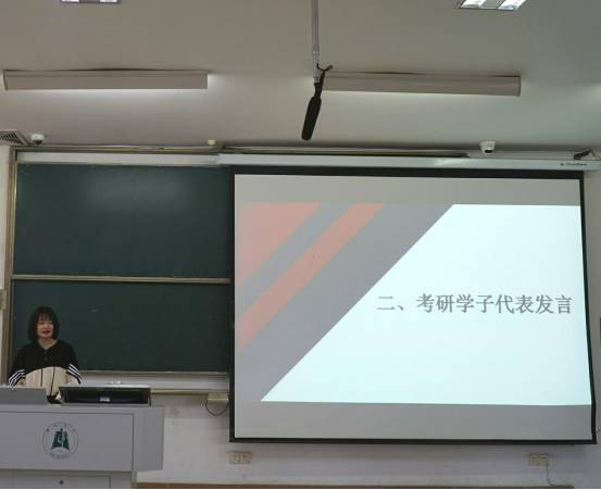 翻译专业2017级学生杨安琪作为考研学子代表进行了发言。她向大家分享了从各个学长学姐考研经验中总结出来的“三不原则”——不盲从,不欺骗,不放弃。