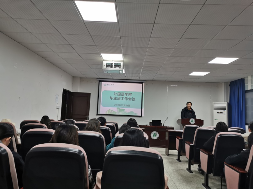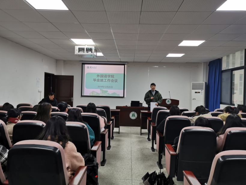 林二友书记代表学院党委对毕业班同学们表达了关心和关怀,并对毕业班学生关心的中国发展、国际形势、假期安全、心理健康、就业、升学留学等方面的问题一一进行了培训和强调。林书记讲到,今年是新中国成立七十周年,中国的发展举世瞩目,这都是在中国共产党的领导下取得的成果。中国和外国相比,有一种社会主义优越性,可以集中力量办大事,从今年西方国家形势来看,中国社会是比较稳定、安全的。在寒假安全教育方面,林书记强调,同学们要注意消防安全,在外面谨防网络诈骗和电信诈骗。林书记在心理健康方面对学生干部进行了培训,讲解了心理委员和网格员的职责和工作方法,请同学们注意周围同学的异常行为和表现,有情况及时上报,如果同学或自己有心理上的困惑,可以去学校的心理健康教育中心咨询,也可以直接和学院老师咨询。在就业和考研升学方面,林书记为正在准备应聘、考研和留学同学们加油鼓劲,同时提醒,考研有一定几率不能去理想院校,要积极调整方向、积极关注就业信息,准备应聘工作。林书记强调,考研的同学们不要有太大压力,考研不是唯一的选择,还有很多路以选。