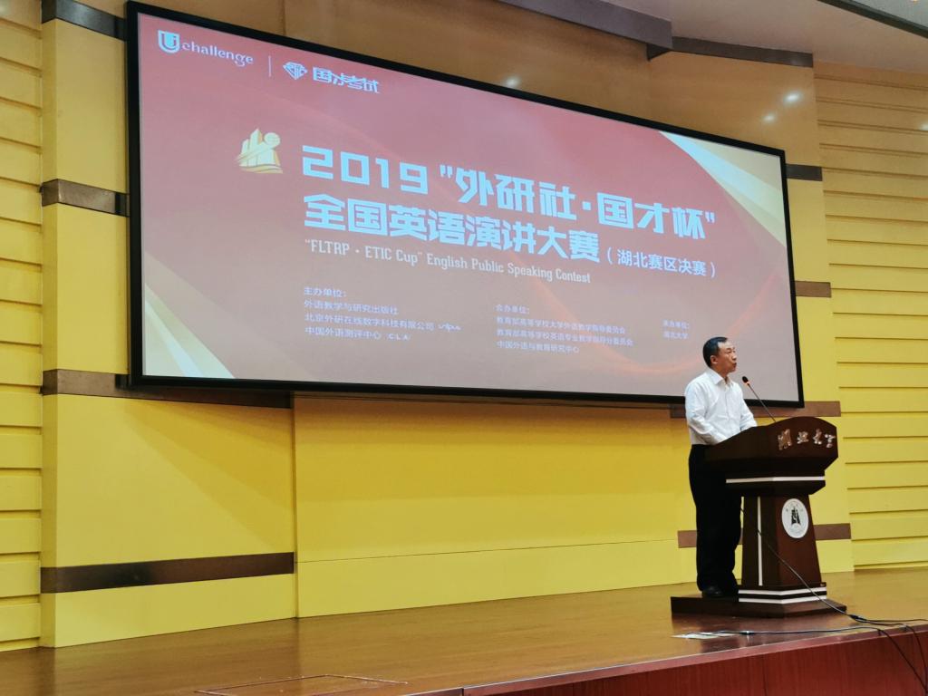下午的决赛以湖北大学党委书记尚钢的讲话拉开了序幕,“新时代赋予新使命,新格局呼唤新举措”,随后湖北省高等教育学会大学外语教学专业委员会秘书长刘心全与外研社湖北省区域主管柳泽宇相继发表讲话,并预祝大赛圆满成功。