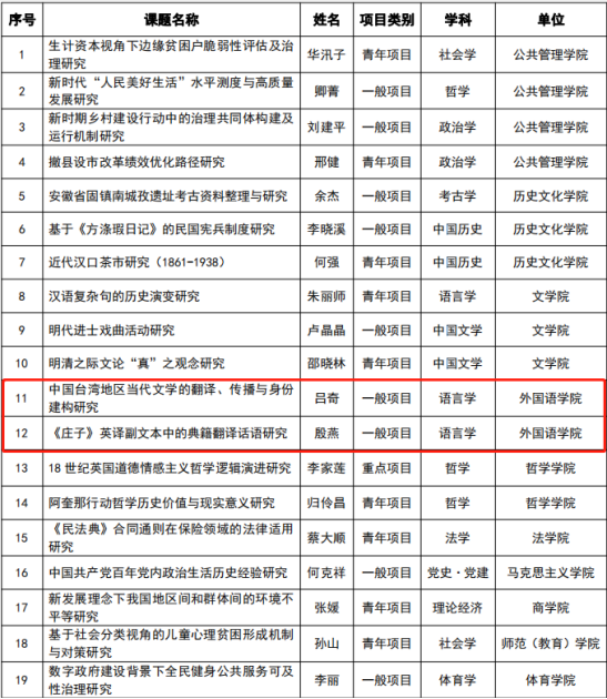 9月24日,全国哲学社会科学工作办公室正式公布2021年国家社科基金年度项目和青年项目立项名单,学校共有19个项目获批立项资助。其中,麻花豆传剧剧mv入口喜获2项国家社科基金一般项目,分别是:吕奇教授主持的《中国台湾地区当代文学的翻译、传播与身份建构研究》、殷燕教授主持的《<庄子>英译副文本中的典籍翻译话语研究》。